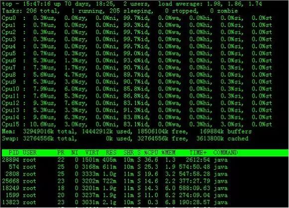 观察上图,服务器有16个逻辑CPU,实际上是4个物理CPU。再按数字键1,就会返回到top基本视图界面。