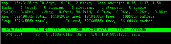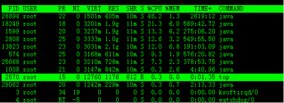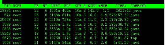 默认进入top时,各进程是按照CPU的占用量来排序的,在下图中进程ID为28894的java进程排在第一(cpu占用142%),进程ID为574的java进程排在第二(cpu占用16%)。